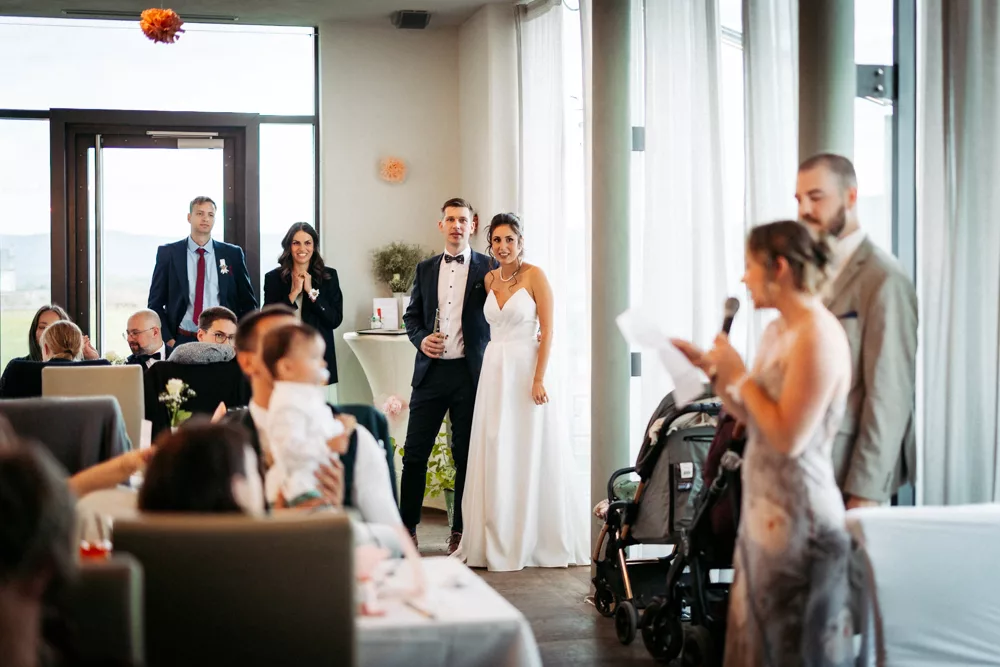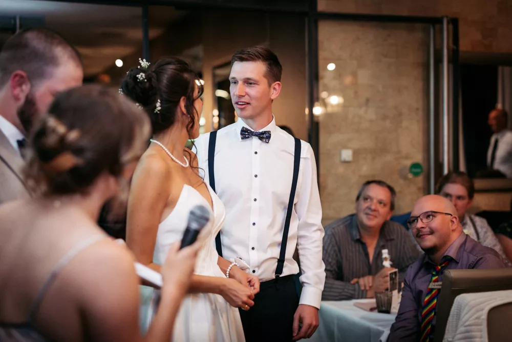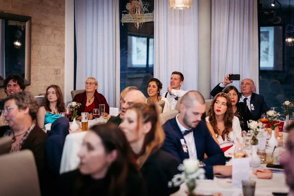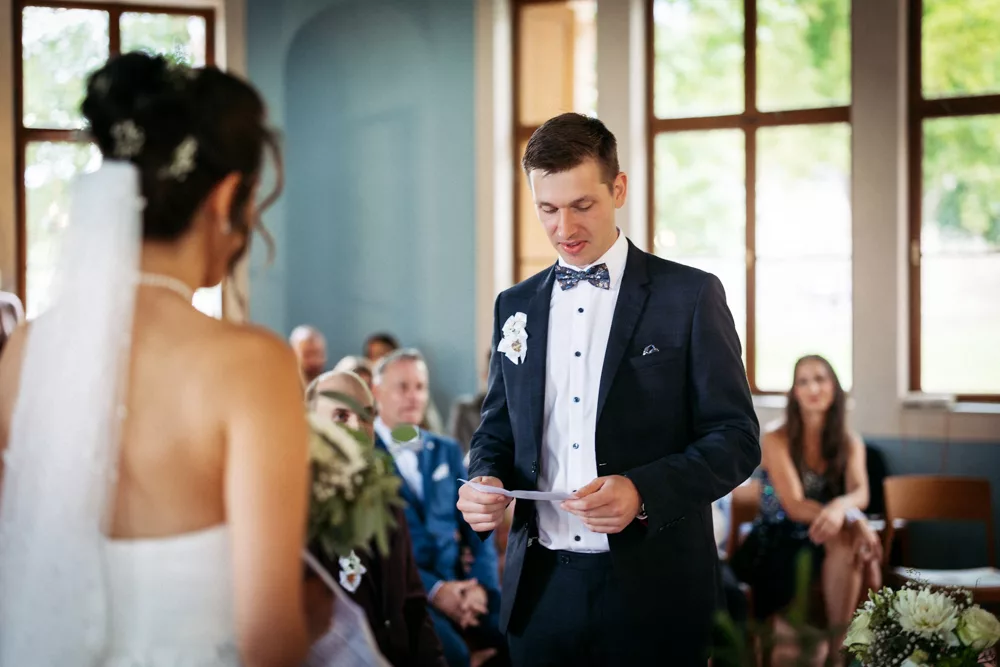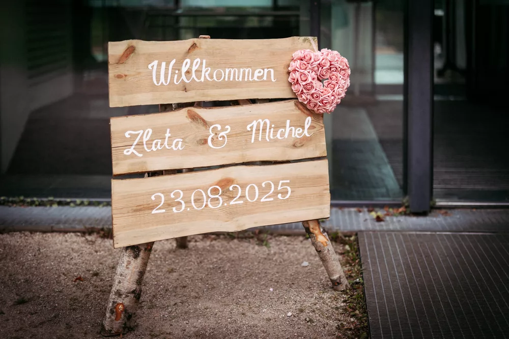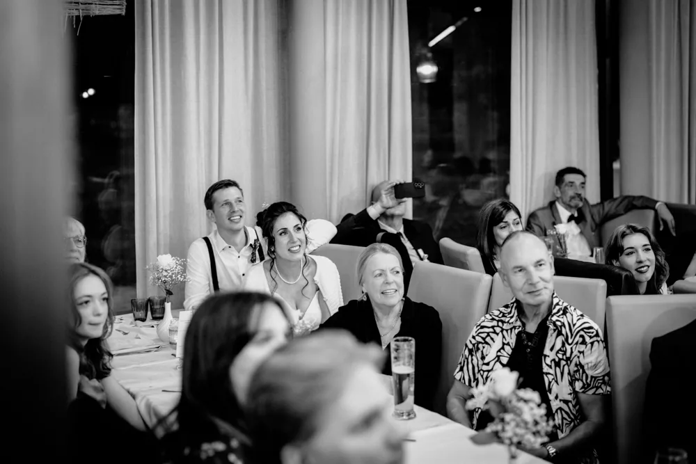 Die freie Trauung im Schallhaus war eines der absoluten Highlights des Tages. Sie wurde komplett selbst organisiert und von engen Freunden des Brautpaares gehalten – zweisprachig auf Deutsch und Serbisch. Genau das machte sie so authentisch. Keine Floskeln, keine Standardtexte, sondern Worte, die wirklich etwas bedeuteten.